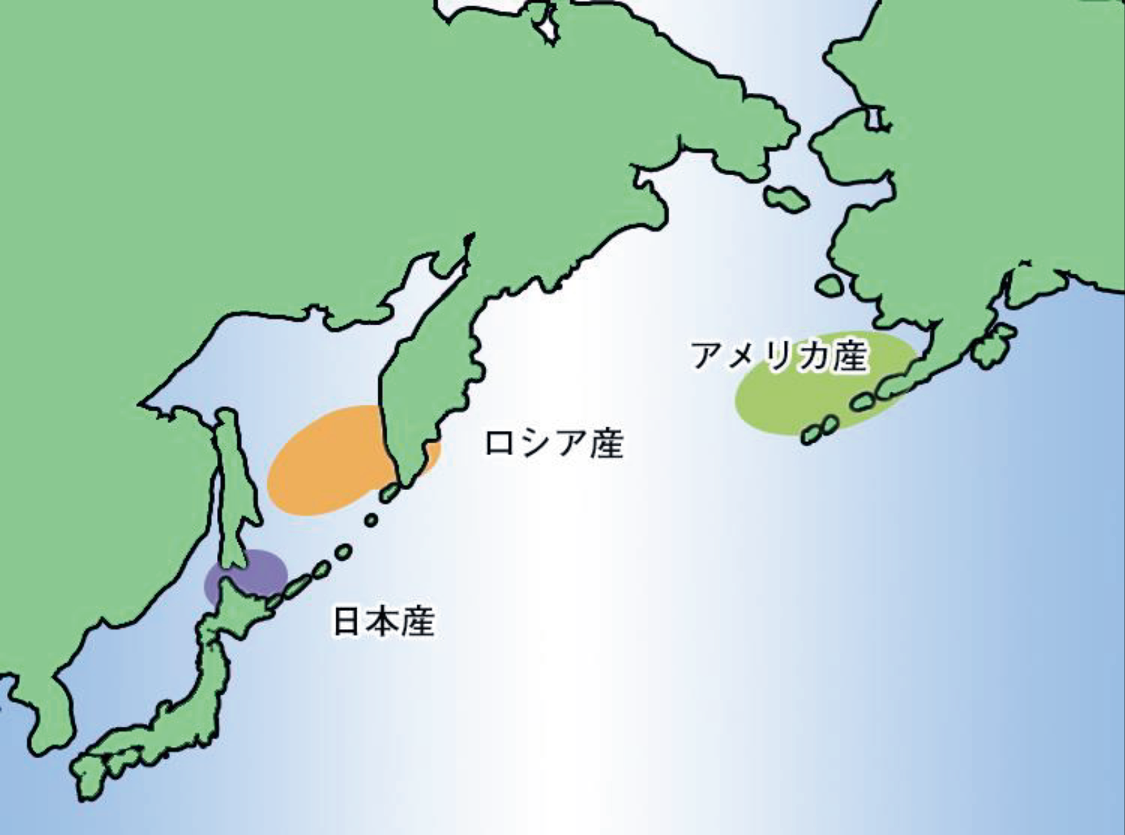すけそうだらは北太平洋に生息し、主な漁獲産地はアメリカ産(アラスカ ベーリング海)、ロシア産(西・東 カムチャッカ)、日本産(日本海、オホーツク海、噴火湾)の3ヵ所となっており、広範囲に生息しておらず、特定の地域回遊しています。